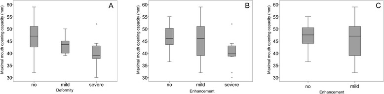 Methods: Seventy-six consecutive JIA patients were included in this study. Rheumatological and orthodontic examinations were performed blinded to MRI findings. Joint effusion and/or increased contrast enhancement of synovium or bone as well as TMJ deformity were assessed on MRI and compared to clinical findings. The maximal mouth opening capacity (MOC) of the JIA patients was compared to normative values obtained from a cohort of 20719 school children from Zürich, Switzerland.