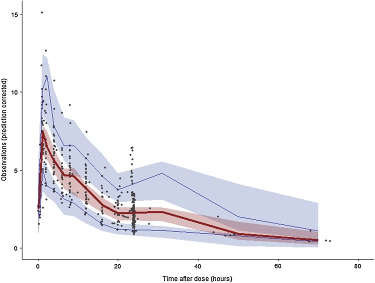 Methods: Caspofungin pharmacokinetic data from 21 intensive care unit (ICU) patients was available. A population pharmacokinetic model was developed. Various dosing regimens (loading dose/maintenance dose) were simulated: licensed regimens (I) 70/50 mg (for BW <80 kg) or 70/70 mg (for BW >80 kg); and (II) 70/35 mg (for Child-Pugh score B); and adapted regimens (III) 100/50 mg (for Child-Pugh score B); (IV) 100/70 mg; and (V) 100/100 mg. Target attainment based on a preclinical pharmacokinetic target for Candida albicans was assessed for relevant minimal inhibitory concentrations (MICs).
