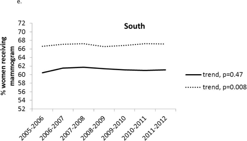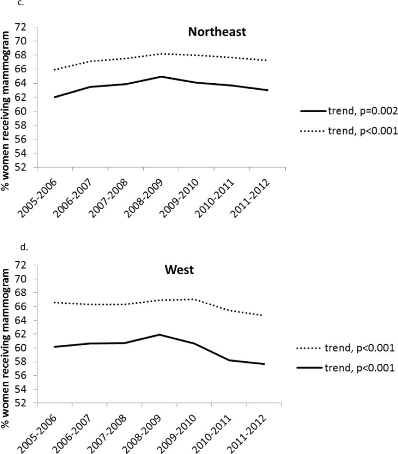 Results: There was a slight decrease in mammography usage among 40-49 year old US women after the 2008-2009 biennial period (p<0.001). There were some regional differences in mammography trends, with the West showing the greatest difference in odds of 40-49 year olds receiving a mammography in 2011-2012 compared to 2008-2009 (OR: 0.93; 95% CI: 0.91-0.94). Although trends for 50-59 year olds mirrored that of 40-49 year olds, the younger age group had a stronger decline in 2009-2010 and 2010-2011.