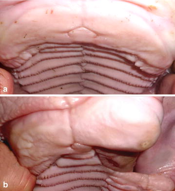 Results: Nine cases were included in the study and they shared absence of the abaxial rostral part of the processus (proc.) nasalis of the os incisivum, partial loss of the rugae palatinae and the dental plate. A sigmoid curvature of the rostral lower jaw as well as a lateral deviation of the face and rostral lower jaw was highly variable in their expression. These deformations were present in eight of nine cases. In addition to the complete CLJ, three animals had an incomplete CLJ on the contralateral site with variable defects of the rostral part of the proc. nasalis of the os incisivum.