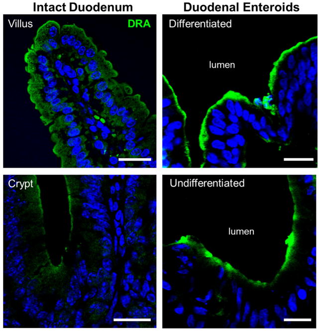 Methods: Human intestinal tissue specimens were obtained from an endoscopic biopsy or surgical resections performed at Johns Hopkins Hospital. Crypts were isolated, enteroids were propagated in culture, induced to undergo differentiation, and transduced with lentiviral vectors. Crypt markers, surface cell enzymes, and membrane ion transporters were characterized using quantitative reverse-transcription polymerase chain reaction, immunoblot, or immunofluorescence analyses. We used multiphoton and time-lapse confocal microscopy to monitor intracellular pH and luminal dilatation in enteroids under basal and regulated conditions.
