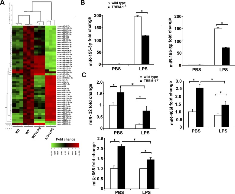 Triggering receptors expressed on myeloid cell-1 (TREM-1) is a superimmunoglobulin receptor expressed on myeloid cells. Synergy between TREM-1 and Toll-like receptor amplifies the inflammatory response; however, the mechanisms by which TREM-1 accentuates inflammation are not fully understood. In this study, we investigated the role of TREM-1 in a model of LPS-induced lung injury and neutrophilic inflammation. We show that TREM-1 is induced in lungs of mice with LPS-induced acute neutrophilic inflammation. TREM-1 knockout mice showed an improved survival after lethal doses of LPS with an attenuated inflammatory response in the lungs. Deletion of TREM-1 gene resulted in significantly reduced neutrophils and proinflammatory cytokines and chemokines, particularly IL-1β, TNF-α, and IL-6. Physiologically deletion of TREM-1 conferred an immunometabolic advantage with low oxygen consumption rate (OCR) sparing the respiratory capacity of macrophages challenged with LPS. Furthermore, we show that TREM-1 deletion results in significant attenuation of expression of miR-155 in macrophages and lungs of mice treated with LPS. Experiments with antagomir-155 confirmed that TREM-1-mediated changes were indeed dependent on miR-155 and are mediated by downregulation of suppressor of cytokine signaling-1 (SOCS-1) a key miR-155 target. These data for the first time show that TREM-1 accentuates inflammatory response by inducing the expression of miR-155 in macrophages and suggest a novel mechanism by which TREM-1 signaling contributes to lung injury. Inhibition of TREM-1 using a nanomicellar approach resulted in ablation of neutrophilic inflammation suggesting that TREM-1 inhibition is a potential therapeutic target for neutrophilic lung inflammation and acute respiratory distress syndrome (ARDS).