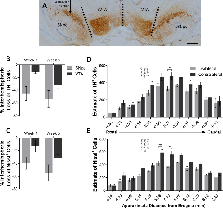 Parkinson's disease (PD) manifests clinically as bradykinesia, rigidity, and development of a resting tremor, primarily due to degeneration of dopaminergic nigrostriatal pathways in the brain. Intranigral administration of the irreversible ubiquitin proteasome system inhibitor, lactacystin, has been used extensively to model nigrostriatal degeneration in rats, and study the effects of candidate neuroprotective agents on the integrity of the dopaminergic nigrostriatal system. Recently however, adjacent extra-nigral brain regions such as the ventral tegmental area (VTA) have been noted to also become affected in this model, yet their integrity in studies of candidate neuroprotective agents in the model have largely been overlooked. Here we quantify the extent and distribution of dopaminergic degeneration in the VTA of rats intranigrally lesioned with lactacystin, and quantify the extent of VTA dopaminergic neuroprotection after systemic treatment with an epigenetic therapeutic agent, valproate, shown previously to protect dopaminergic SNpc neurons in this model. We found that unilateral intranigral administration of lactacystin resulted in a 53.81% and 31.72% interhemispheric loss of dopaminergic SNpc and VTA neurons, respectively. Daily systemic treatment of lactacystin lesioned rats with valproate however resulted in dose-dependant neuroprotection of VTA neurons. Our findings demonstrate that not only is the VTA also affected in the intranigral lactacystin rat model of PD, but that this extra-nigral brain region is substrate for neuroprotection by valproate, an agent shown previously to induce neuroprotection and neurorestoration of SNpc dopaminergic neurons in this model. Our results therefore suggest that valproate is a candidate for extra-nigral as well as intra-nigral neuroprotection.