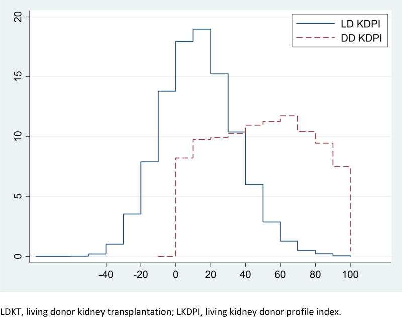 Choosing between multiple living kidney donors, or evaluating offers in kidney paired donation, can be challenging because no metric currently exists for living donor quality. Furthermore, some deceased donor (DD) kidneys can result in better outcomes than some living donor kidneys, yet there is no way to compare them on the same scale. To better inform clinical decision-making, we created a living kidney donor profile index (LKDPI) on the same scale as the DD KDPI, using Cox regression and adjusting for recipient characteristics. Donor age over 50 (hazard ratio [HR] per 10 years = 1.15 1.241.33 ), elevated BMI (HR per 10 units = 1.01 1.091.16 ), African-American race (HR = 1.15 1.251.37 ), cigarette use (HR = 1.09 1.161.23 ), as well as ABO incompatibility (HR = 1.03 1.271.58 ), HLA B (HR = 1.03 1.081.14 ) mismatches, and DR (HR = 1.04 1.091.15 ) mismatches were associated with greater risk of graft loss after living donor transplantation (all p < 0.05). Median (interquartile range) LKDPI score was 13 (1-27); 24.2% of donors had LKDPI < 0 (less risk than any DD kidney), and 4.4% of donors had LKDPI > 50 (more risk than the median DD kidney). The LKDPI is a useful tool for comparing living donor kidneys to each other and to deceased donor kidneys.