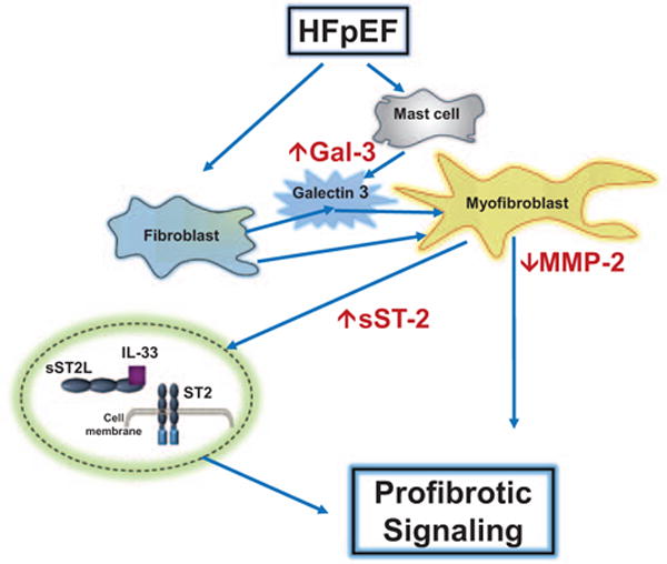 Background: Heart failure with preserved ejection fraction is a clinical syndrome that has been associated with changes in the extracellular matrix. The purpose of this study was to determine whether profibrotic biomarkers accurately reflect the presence and severity of disease and underlying pathophysiology and modify response to therapy in patients with heart failure with preserved ejection fraction.