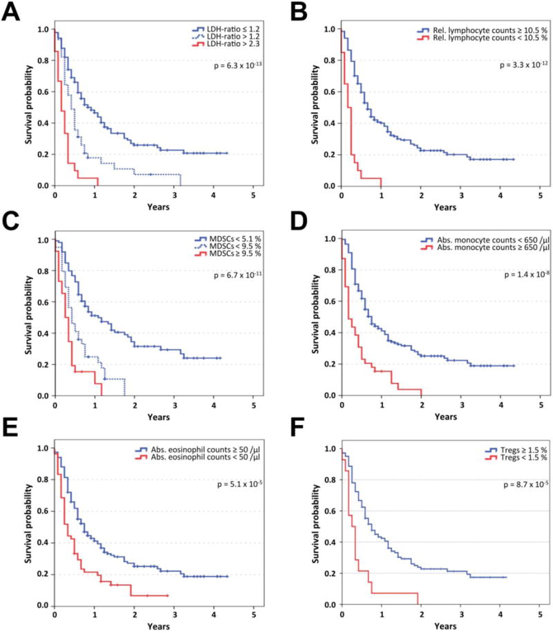 Experimental design: Frequencies of myeloid-derived suppressor cells (MDSC) and regulatory T cells (Treg), serum lactate dehydrogenase (LDH), routine blood counts, and clinical characteristics were assessed in 209 patients. Endpoints were overall survival (OS) and best overall response. Statistical calculations were done by Kaplan-Meier and Cox regression analysis, including calibration and discrimination by C-statistics.