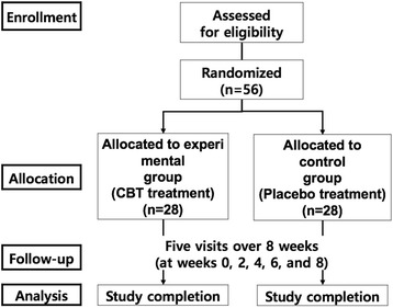 Methods/design: A randomized, double-blind, parallel-group, and placebo-controlled trial will be conducted. Fifty-six participants with acne vulgaris will be randomized into one of two groups: the CBT or placebo groups. After randomization, participants will be prescribed either CBT or placebo three times a day at a dose of 5 g after meals for 8 weeks. The following outcome measurements will be used in the examination of subjects: the mean percentage change and the count change of the inflammatory and non-inflammatory acne lesions, the temperature of facial points on digital infrared thermal imaging (DITI), serum cortisol, serum dehydroepiandrosterone-sulfate (DHEA-S), visual analogue scale (VAS), investigator global assessment (IGA), and severity score on the Korean Acne Grading System (KAGS) from baseline to the end of the trial.