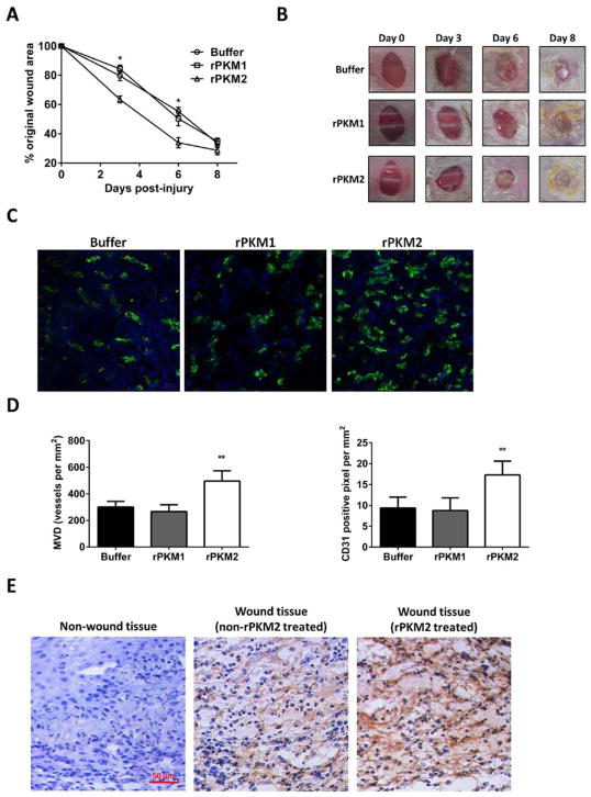 Neutrophils infiltration/activation following wound induction marks the early inflammatory response in wound repair. However, the role of the infiltrated/activated neutrophils in tissue regeneration/proliferation during wound repair is not well understood. Here, we report that infiltrated/activated neutrophils at wound site release pyruvate kinase M2 (PKM2) by its secretive mechanisms during early stages of wound repair. The released extracellular PKM2 facilitates early wound healing by promoting angiogenesis at wound site. Our studies reveal a new and important molecular linker between the early inflammatory response and proliferation phase in tissue repair process.