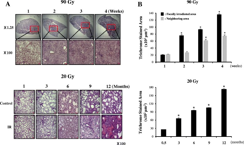 Results: Central areas of the mouse left lung were focally-irradiated (3 mm in diameter) with a single high-dose of radiation (90 Gy). Temporal changes in gene expression in the irradiated and non-irradiated neighboring lung regions were analyzed by microarray. For comparison, the long-term effect (12 months) of 20 Gy radiation on a diffuse region of lung was also measured. The majority of genes were down-regulated in the focally-irradiated lung areas at 2 to 3 weeks after irradiation. This pattern of gene expression was clearly different than gene expression in the diffuse region of lungs exposed to low-dose radiation. Ontological and pathway analyses indicated these down-regulated genes were mainly associated with organ development. Although the number was small, genes that were up-regulated after focal irradiation were associated with immune-related functions. The temporal patterns of gene expression and the associated biological functions were also similar in non-irradiated neighboring lung regions, although statistical significance was greatly reduced when compared with those from focally-irradiated areas of the lung. From network analysis of temporally regulated genes, we identified inter-related modules associated with diverse functions, including organ development and the immune response, in both the focally-irradiated regions and non-irradiated neighboring lung regions.