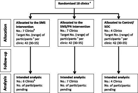 Methods/design: We designed a cluster randomized trial to assess the efficacy of an SMS intervention and a peer-navigation intervention to improve retention in care and treatment, timely linkage to care and treatment, medication adherence, and prevention behaviors in South Africa. Eighteen primary and community healthcare clinics in Rustenburg and Moses Kotane Sub-districts in the North West Province were randomized to one of three conditions: SMS intervention (n = 7), peer navigation intervention (n = 7), or standard of care (n = 4). Approximately 42 participants are being recruited at each clinic, which will result in a target of 750 participants. Eligible participants include patients accessing HIV testing or care in a study clinic, recently diagnosed with HIV, aged 18 years or older, and with access to a cellular telephone where they are willing to receive automated SMS with HIV-related messaging. Data collection includes extraction of visit information from clinical files and participant surveys at baseline, 6 months, and 12 months. Intent-to-treat (ITT) analysis will explore differences between randomization arms and the primary outcome of patient retention in care at 12 months following enrollment. We will also explore secondary outcomes including participants' a) timely linkage to care (within 3 months of HIV diagnosis), b) adherence to treatment based on self-report and clinic's medication dispensation dates, and c) condom-use behaviors.