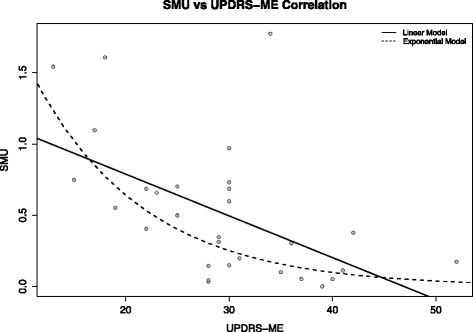 Results: The proposed measures reached 100 % accuracy in distinguishing between patients with Parkinson's disease (PD) and control subjects. We also demonstrate the existence of a linear relationship and an exponential trend between pooled structural and functional striatal characteristics and the Unified Parkinson's disease Rating Scale (UPDRS) motor score.