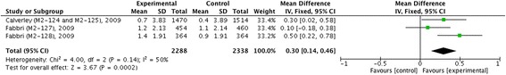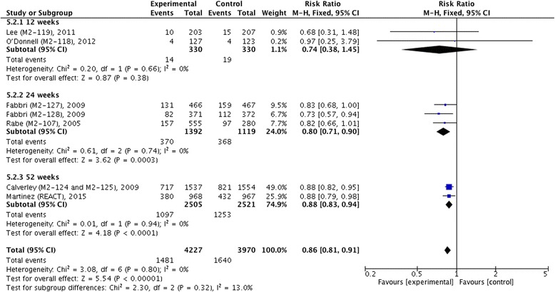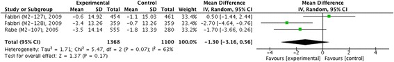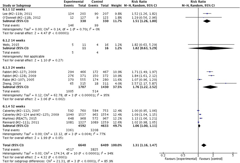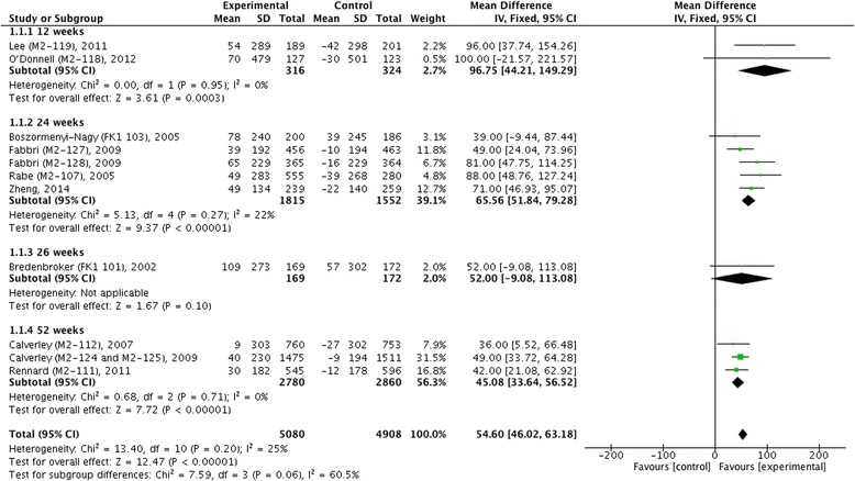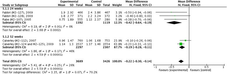 Results: Thirteen trials with a total of 14,563 patients were pooled in our final studies. Except for SGRQ (I (2) = 63 %, χ (2) = 1.71, P = 0.07) and adverse events (I (2) = 94 %, χ (2) = 0.03, P < 0.001), we did not find statistical heterogeneity in outcome measures. The pooled MD of pre- and post-bronchodilator FEV1 was 54.60 (95 % confidence interval (CI) 46.02 ~ 63.18) and 57.86 (95 % CI 49.80 ~ 65.91), and both showed significant improvement in patients with roflumilast (z = 12.47, P <0.001; z = 14.07, P < 0.001), so did in FVC (MD 90.37, 95 % CI 73.95 ~ 106.78, z = 10.79, P < 0.001). Significant alleviation of TDI (MD 0.30, 95 % CI 0.14 ~ 0.46, z = 3.67, P < 0.001) and decrease of acute exacerbation (RR 0.86, 95 % CI 0.81 ~ 0.91, z = 5.54, P < 0.001) were also identified in treatment of roflumilast, but without significant difference in SGRQ (MD -1.30, 95 % CI -3.16 ~ 0.56, z = 1.37, P = 0.17). Moreover, roflumilast significantly increased the incidence of adverse events compared with placebo (RR 1.31, 95 % CI 1.16 ~ 1.47, z = 4.32, P < 0.001).