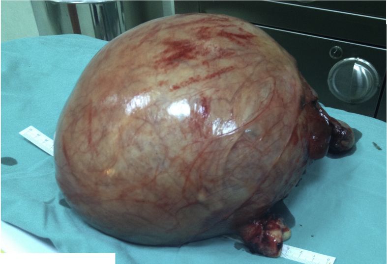 Presentation of case: A 48-year-old multiparous woman visited our outpatient clinic for routine control. She had no symptoms or complaints. Her last health service visit was over 5 years ago, in which she was told that she had a small uterine leiomyoma, which did not require further management. Abdominal examination revealed a large mass extended above the umbilicus, and there was no abdominal tenderness. Abdominal ultrasonography showed a large solid mass occupying the abdomen. Routine laboratory test results were normal, except the hemoglobin level, which was 7.88 g/dl. A total abdominal hysterectomy with bilateral salpingo-oophorectomy was performed. The final diagnosis was a 17-cm, 3985-g intramural, myomatous, cellular leiomyoma that occurred without secondary changes, necrosis, cellular atypia, or mitosis.