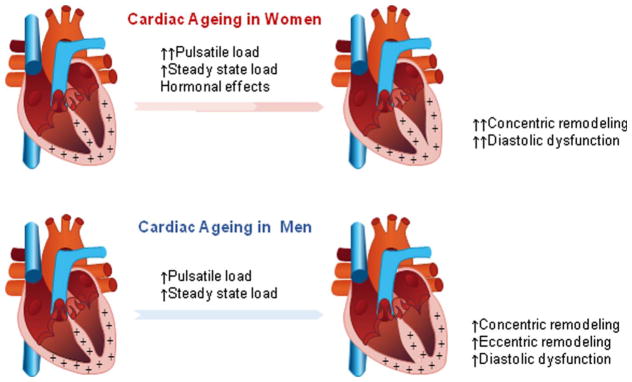 Despite recent progress in identifying and narrowing the gaps in cardiovascular outcomes between men and women, general understanding of how and why cardiovascular disease presentations differ between the sexes remains limited. Sex-specific patterns of cardiac and vascular ageing play an important role and, in fact, begin very early in life. Differences between the sexes in patterns of age-related cardiac remodelling are associated with the relatively greater prevalence in women than in men of heart failure with preserved ejection fraction. Similarly, sex variation in how vascular structure and function change with ageing contributes to differences between men and women in how coronary artery disease manifests typically or atypically over the adult life course. Both hormonal and non-hormonal factors underlie sex differences in cardiovascular ageing and the development of age-related disease. The midlife withdrawal of endogenous oestrogen appears to augment the age-related increase in cardiovascular risk seen in postmenopausal compared with premenopausal women. However, when compared with intrinsic biological differences between men and women that are present throughout life, this menopausal transition may not be as substantial an actor in determining cardiovascular outcomes.