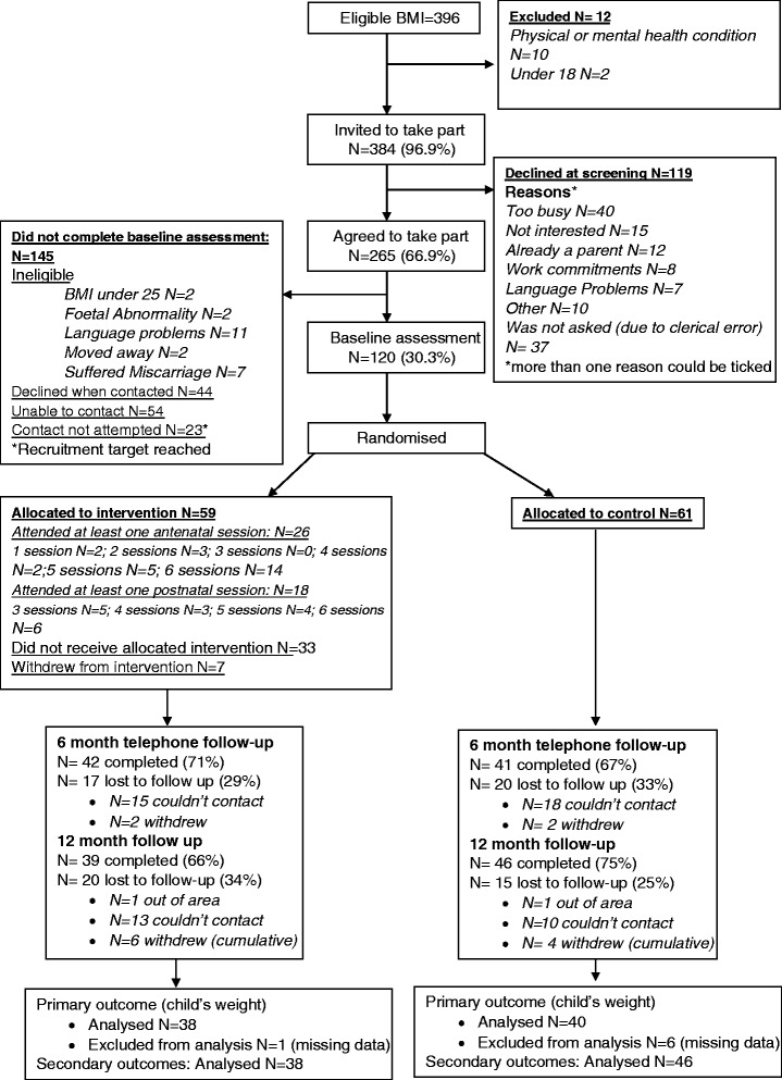 Methods: A feasibility randomised controlled trial was conducted in Bradford, England. One hundred twenty overweight/obese pregnant women (Body Mass Index [BMI] ≥25 kg/m(2)) were recruited between 10-26 weeks gestation. Consenting women were randomly allocated to HAPPY (6 antenatal, 6 postnatal sessions: N = 59) or usual care (N = 61). Appropriate outcome measures for a full trial were explored, including: infant's length and weight, woman's BMI, physical activity and dietary intake of the women and infants. Health economic data were collected. Measurement occurred before randomisation and when the infant was aged 6 months and 12 months. Feasibility outcomes were: recruitment/attrition rates, and acceptability of: randomisation, measurement, and intervention. Intra-class correlations for infant weight were calculated. Fidelity was assessed through observations and facilitator feedback. Focus groups and semi-structured interviews explored acceptability of methods, implementation, and intervention content.