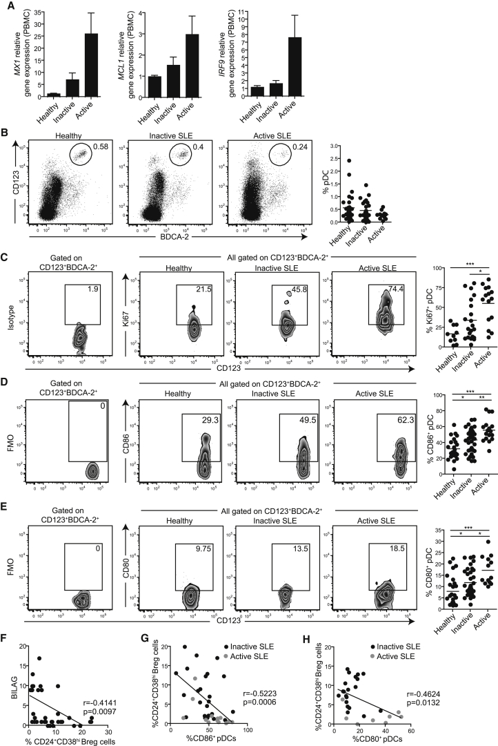 Signals controlling the generation of regulatory B (Breg) cells remain ill-defined. Here we report an "auto"-regulatory feedback mechanism between plasmacytoid dendritic cells (pDCs) and Breg cells. In healthy individuals, pDCs drive the differentiation of CD19(+)CD24(hi)CD38(hi) (immature) B cells into IL-10-producing CD24(+)CD38(hi) Breg cells and plasmablasts, via the release of IFN-α and CD40 engagement. CD24(+)CD38(hi) Breg cells conversely restrained IFN-α production by pDCs via IL-10 release. In systemic lupus erythematosus (SLE), this cross-talk was compromised; pDCs promoted plasmablast differentiation but failed to induce Breg cells. This defect was recapitulated in healthy B cells upon exposure to a high concentration of IFN-α. Defective pDC-mediated expansion of CD24(+)CD38(hi) Breg cell numbers in SLE was associated with altered STAT1 and STAT3 activation. Both altered pDC-CD24(+)CD38(hi) Breg cell interactions and STAT1-STAT3 activation were normalized in SLE patients responding to rituximab. We propose that alteration in pDC-CD24(+)CD38(hi) Breg cell interaction contributes to the pathogenesis of SLE.