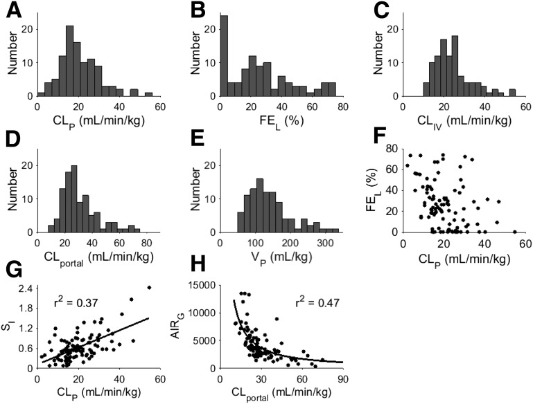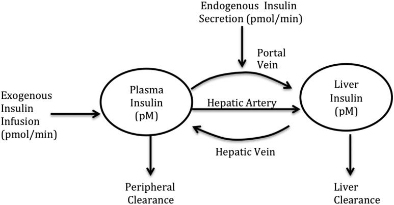 Insulin clearance is a highly variable and important factor that affects circulating insulin concentrations. We developed a novel model-based method to estimate both hepatic and extrahepatic insulin clearance using plasma insulin and C-peptide profiles obtained from the insulin-modified frequently sampled intravenous glucose tolerance test. Data from 100 African immigrants without diabetes (mean age 38 years, body weight 81.7 kg, fasting plasma glucose concentration 83 mg/dL, and fasting insulin concentration 37 pmol/L) were used. Endogenous insulin secretion (calculated by C-peptide deconvolution) and insulin infusion rates were used as inputs to a new two-compartment model of insulin kinetics and hepatic and extrahepatic clearance parameters were estimated. Good agreement between modeled and measured plasma insulin profiles was observed (mean normalized root mean square error 6.8%), and considerable intersubject variability in parameters of insulin clearance among individuals was identified (the mean [interquartile range] for hepatic extraction was 25.8% [32.7%], and for extrahepatic insulin clearance was 20.7 mL/kg/min [11.7 mL/kg/min]). Parameters of insulin clearance were correlated with measures of insulin sensitivity and acute insulin response to glucose. The method described appears promising for future research aimed at characterizing variability in insulin clearance and the mechanisms involved in the regulation of insulin clearance.