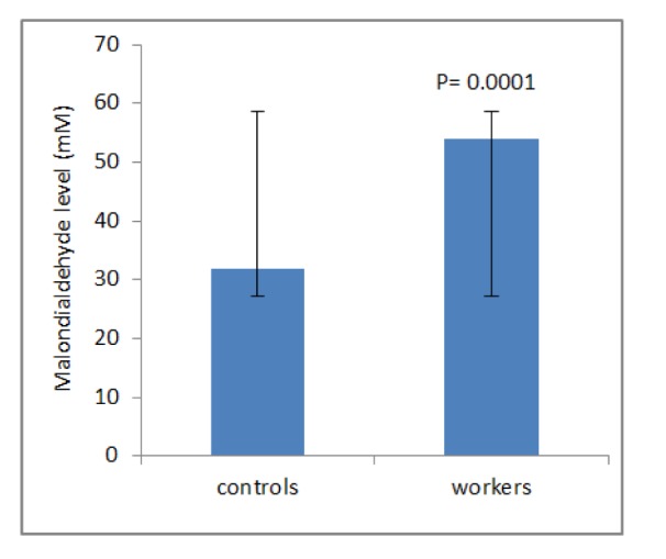 The purpose of the present study was to investigate whether the markers of oxidative stress could be altered in workers exposed to asbestos. A comparative cross-sectional research was conducted in a group of 50 subjects exposed to asbestos and another group of 50 with the same age and sex unexposed to asbestos. Malondialdehyde (MDA), total thiol molecule (TTM), total antioxidant capacity (TAC), and DNA damage, were measured in the blood samples of workers and controls. Compared to the control group, the workers showed higher blood levels of DNA damage (P=0.0001) and MDA (P=0.0001). The workers showed lower TTM (P=0.02) as compared with the control group. There was no considerable difference on the level of TAC (P=0.1) between the groups. The workers indicated clinical symptoms such as breathlessness, phlegm, coughing and wheezing. There was a positive correlation between levels of 8-OHdG and MDA of asbestos workers and the smoking status suggesting the negative role of smoking.
