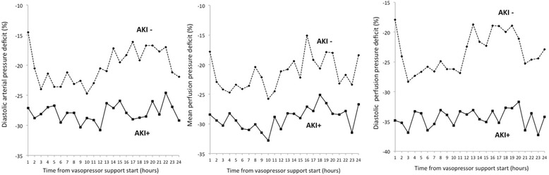 Background: In vasopressor-dependent patients who had undergone cardiovascular surgery, we examined whether those with progression of acute kidney injury (AKI) had a greater difference (deficit) between premorbid and within-ICU hemodynamic pressure-related parameters compared to those without AKI progression.