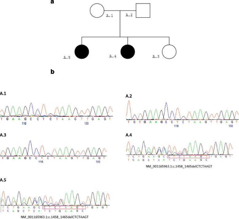Case presentation: Two sisters of a non-consanguineous Palestinian family from the Arab community in Israel attended our child development and pediatric neurology clinic due to recurrent seizures and developmental delay. Genomic DNA was extracted from peripheral blood lymphocytes of all family members and a SCN1A mutation in exon 10 was revealed by Sanger sequencing in both affected siblings but not in the parents. Our data present a case of Dravet syndrome caused by a novel heterozygous SCN1A deletion (c.1458_1465delCTCTAAGT) in two affected siblings. Our findings add to the spectrum of mutations known in the SCN1A gene and confirm parental mosaicism as a mechanism relevant for transmission of this disease.