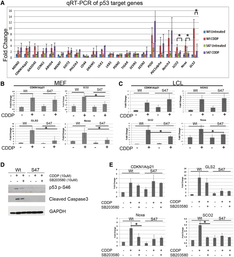 A nonsynonymous single-nucleotide polymorphism at codon 47 in TP53 exists in African-descent populations (P47S, rs1800371; referred to here as S47). Here we report that, in human cell lines and a mouse model, the S47 variant exhibits a modest decrease in apoptosis in response to most genotoxic stresses compared with wild-type p53 but exhibits a significant defect in cell death induced by cisplatin. We show that, compared with wild-type p53, S47 has nearly indistinguishable transcriptional function but shows impaired ability to transactivate a subset of p53 target genes, including two involved in metabolism:Gls2(glutaminase 2) and Sco2 We also show that human and mouse cells expressing the S47 variant are markedly resistant to cell death by agents that induce ferroptosis (iron-mediated nonapoptotic cell death). We show that mice expressing S47 in homozygous or heterozygous form are susceptible to spontaneous cancers of diverse histological types. Our data suggest that the S47 variant may contribute to increased cancer risk in individuals of African descent, and our findings highlight the need to assess the contribution of this variant to cancer risk in these populations. These data also confirm the potential relevance of metabolism and ferroptosis to tumor suppression by p53.