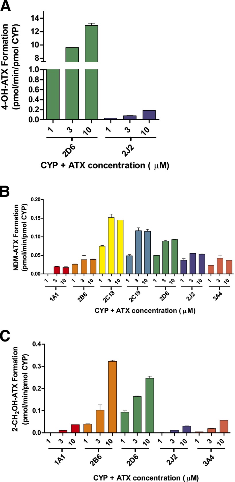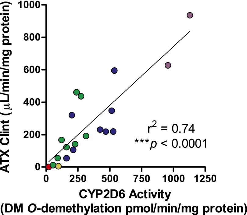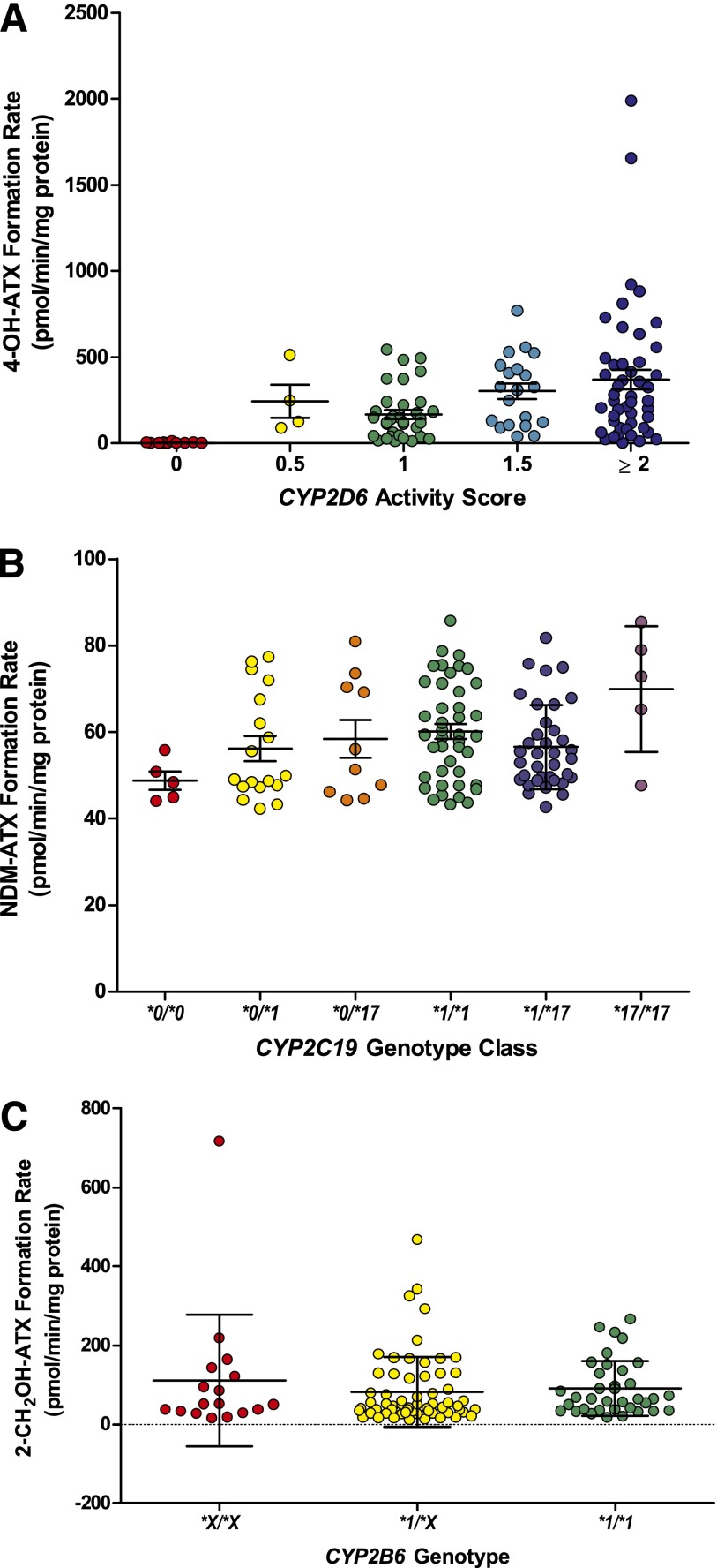 Atomoxetine (ATX) is a second-line nonstimulant medication used to control symptoms of attention deficit hyperactivity disorder (ADHD). Inconsistent therapeutic efficacy has been reported with ATX, which may be related to variable CYP2D6-mediated drug clearance. We characterized ATX metabolism in a panel of human liver samples as a basis for a bottom-up PBPK model to aid in ATX exposure prediction and control. Km, Vmax, and Clint values in pooled human liver microsomes (HLMs) were 2.4 µM, 479 pmol/min/mg protein, and 202 µl/min/mg protein, respectively. Mean population values of kinetic parameters are not adequate to describe variability in a population, given that Km, Vmax, and Clint values from single-donor HLMs ranged from 0.93 to 79.2 µM, 20.0 to 1600 pmol/min/mg protein, and 0.3 to 936 µl/min/mg protein. All kinetic parameters were calculated from 4-hydroxyatomoxetine (4-OH-ATX) formation. CYP2E1 and CYP3A contributed to 4-OH-ATX formation in livers with CYP2D6 intermediate and poor metabolizer status. In HLMs with lower CYP2D6 activity levels, 2-hydroxymethylatomoxetine (2-CH2OH-ATX) formation became a more predominant pathway of metabolism, which appeared to be catalyzed by CYP2B6. ATX biotransformation at clinically relevant plasma concentrations was characterized in a panel of pediatric HLM (n = 116) samples by evaluating primary metabolites. Competing pathways of ATX metabolism [N-desmethylatomoxetine (NDM-ATX) and 2-CH2OH-ATX formation] had increasing importance in livers with lesser CYP2D6 activity, but, overall ATX clearance was still compromised. Modeling ATX exposure to individualize therapy would require comprehensive knowledge of factors that affect CYP2D6 activity as well as an understanding of competing pathways, particularly for individuals with lower CYP2D6 activity.