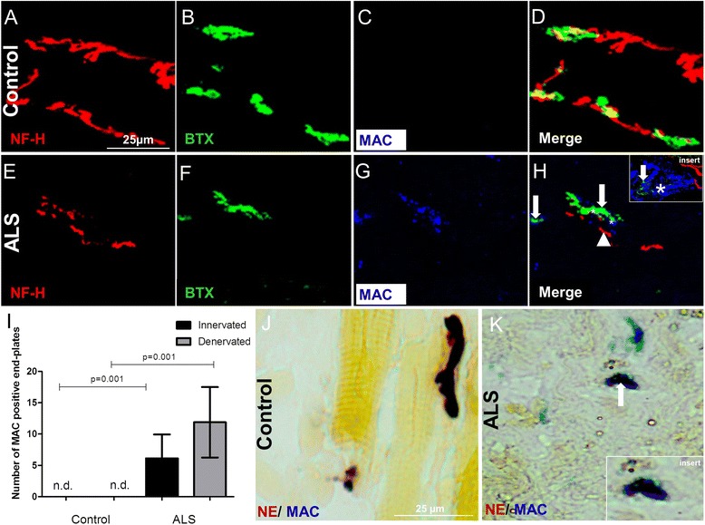 Results: Here, we show that complement activation products and regulators are deposited on the motor end-plates of ALS patients. C1q co-localized with neurofilament in the intercostal muscle of ALS donors and was absent in controls (P = 0.001). In addition, C1q was found deposited on the motor end-plates in the intercostal muscle. MAC was also found deposited on motor end-plates that were innervated by nerves in the intercostal muscle of ALS donors but not in controls (P = 0.001). High levels of the regulators CD55 and CD59 were detected at the motor end-plates of ALS donors but not in controls, suggesting an attempt to counteract complement activation and prevent MAC deposition on the end-plates before they are lost.