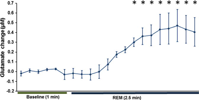 We report on electroencephalograph (EEG) and electromyograph (EMG) measurements concurrently with real-time changes in L-glutamate concentration. These data reveal a link between sleep state and extracellular neurotransmitter changes in a freely-moving (tethered) mouse. This study reveals, for the first time in mice, that the extracellular L-glutamate concentration in the pre-frontal cortex (PFC) increases during periods of extended wakefulness, decreases during extended sleep episodes and spikes during periods of REM sleep. Individual sleep epochs (10 s in duration) were scored as wake, slow-wave (SW) sleep or rapid eye movement (REM) sleep, and then correlated as a function of time with measured changes in L-glutamate concentrations. The observed L-glutamate levels show a statistically significant increase of 0.86 ± 0.26 μM (p < 0.05) over 37 wake episodes recorded from all mice (n = 6). Over the course of 49 measured sleep periods longer than 15 min, L-glutamate concentrations decline by a similar amount (0.88 ± 0.37 μM, p < 0.08). The analysis of 163 individual REM sleep episodes greater than one min in length across all mice (n = 6) demonstrates a significant rise in L-glutamate levels as compared to the 1 min preceding REM sleep onset (RM-ANOVA, DF = 20, F = 6.458, p < 0.001). The observed rapid changes in L-glutamate concentration during REM sleep last only between 1 and 3 min. The approach described can also be extended to other regions of the brain which are hypothesized to play a role in sleep. This study highlights the importance of obtaining simultaneous measurements of neurotransmitter levels in conjunction with sleep markers to help elucidate the underlying physiological and ultimately the genetic components of sleep.
