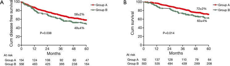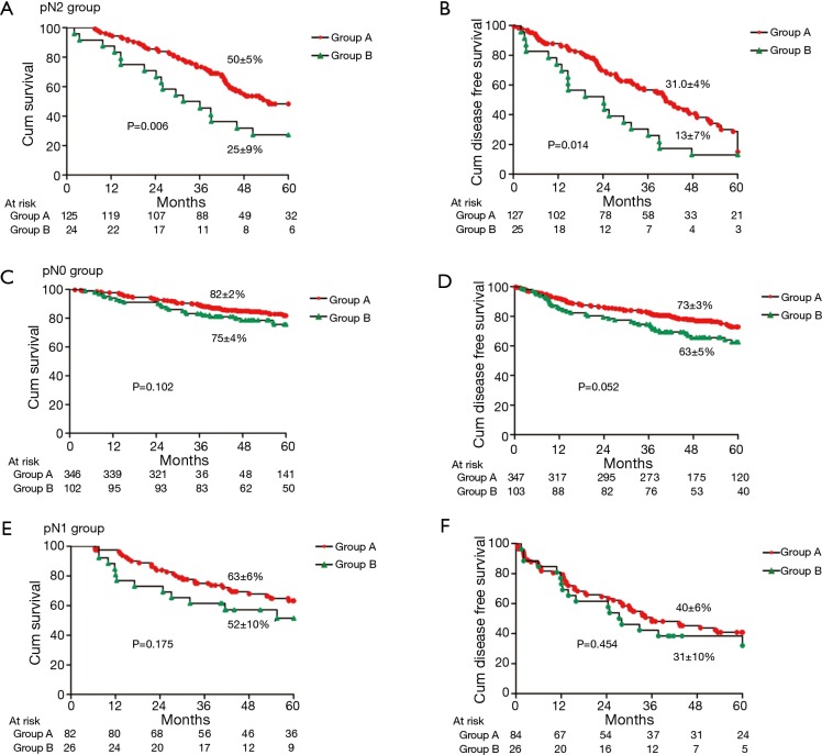 Results: Five-year overall survival (OS) and 5-year disease-free survival (DFS) were significantly different between group A versus B [72%±2% vs. 63%±4% (OS), P=0.014; 58.0%±2% vs. 49%±4% (DFS), P=0.038] in the whole cohort. After stratification by pN status, this difference was remained in pN2 subgroup [50%±5% vs. 25%±9% (OS), P=0.006; 31.0%±4% vs. 13%±7% (DFS), P=0.014], but not in pN0-1 subgroups. Cox regression analysis showed that performing a lymphadenectomy fulfilling NCCN criteria was a significant prognostic factor for OS either in the whole cohort [P=0.003, hazard ratio (HR): 0.598, 95% confidence interval (CI): 0.425-0.841] or in patients of pN2 status (P=0.038, HR: 0.559, 95% CI: 0.323-0.968). Cases with ≥4 N2 stations dissected did not achieve better survival benefit compared to those harvesting 3 stations in cN0/1-pN2 group (P=0.152).