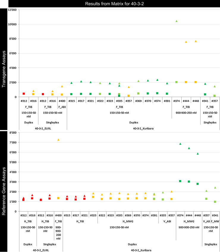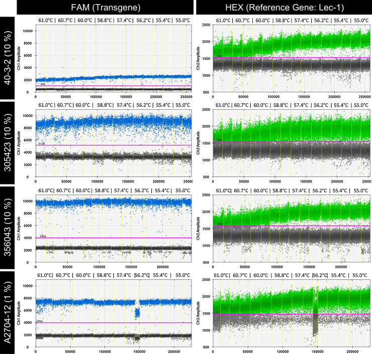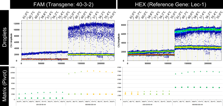 Keywords: ABI, LifeTechnologies (formerly AppliedBiosystems); Bio, DNA Technology/Biosearch Technologies; Cat. No., catalogue number; DNA, deoxyribonucleic acid; Droplet digital PCR (ddPCR); EC, European Commission; ERM, Certified European Reference Material; EU, European Union; EURL-GMFF, European Reference Laboratory for GM Food and Feed; Experience matrix; Food/feed analysis; GM, genetically modified; GMO, genetically modified organism; Genetically modified organism (GMO); HEX,H, hexachlorfluorescein; L, liter; Lec, lectin gene of soy; MIQE, minimal information for publication of quantitative digital PCR experiments; MRPL, minimum required performance limit; MS, Microsoft; MWG, Eurofins-MWG; MeanSignal, mean fluorescence signal value; PCR, polymerase chain reaction; Quantification; SD, standard deviation (of fluorescence signals); TAMRA,T, tetramethylrhodamin; TIB, TIB Molbiol; Tech, technician; VBA, visual basic for applications; VIC,V, fluorescent dye (LifeTechnologies); cp/cp, (gene) copy per (gene) copy; dPCR, digital PCR; ddPCR, droplet digital PCR; fluorescein, FAM,F; gDNA, genomic DNA; qPCR, (quantitative) real-time PCR.
