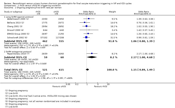Recombinant versus urinary human chorionic gonadotrophin for final oocyte maturation triggering in IVF and ICSI cycles.Cochrane Database Syst Rev. 2011 Apr 13;(4):CD003719. doi: 10.1002/14651858.CD003719.pub3. Cochrane Database Syst Rev. 2011. Update in: Cochrane Database Syst Rev. 2016 Apr 23;4:CD003719. doi: 10.1002/14651858.CD003719.pub4. PMID: 21491386 Updated.