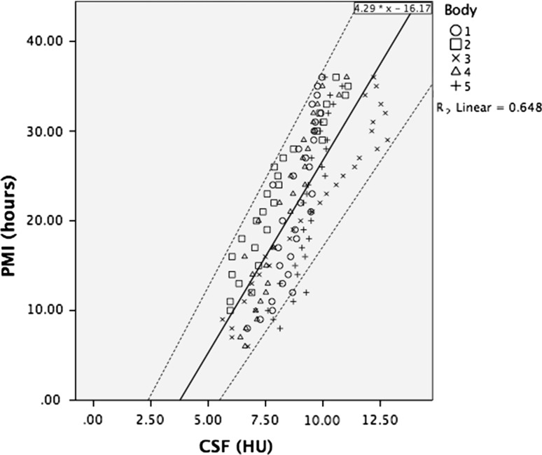Conclusion: The results of group A showed a significant correlation between CSF radiodensity and PMI. The radiodensities in groups B and C were higher than in group A, therefore the maximum PMI can be estimated with the upper 95 % confidence interval of the correlation line of group A.