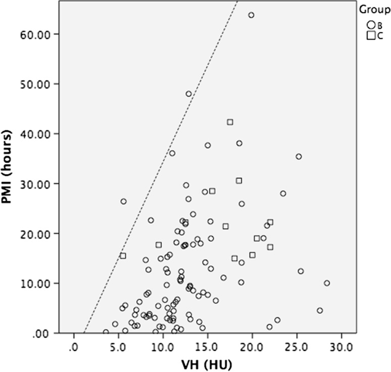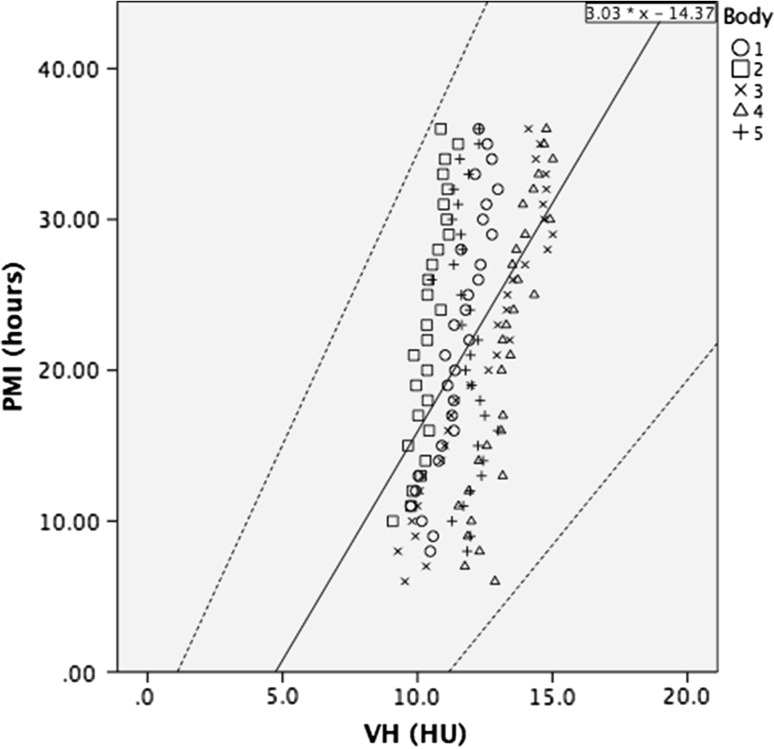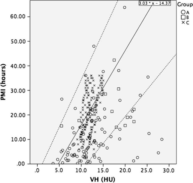 Results: Group A showed increasing radiodensity of the CSF and VH over time (r (2) CSF, 0.65). PMI overruled the influence of temperature (r = 0.99 and p = 0.000). Groups B and C showed more diversity, with CSF and VH radiodensities below the mean regression line of Group A. The formula of this upper limit indicated the maximum PMI and was correct for >95 % of the cadavers.