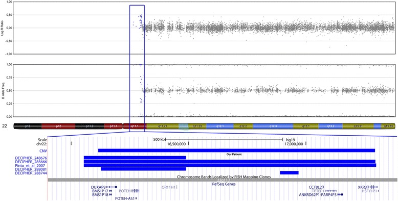 Results: Following the application of stringent filter criteria, seven rare CNVs were identified: n = 4, not present in 1307 in-house controls; n = 3, frequency of <0.002 in controls. These CNVs ranged from 1 to 6.08 Mb in size. To identify smaller CNVs, relaxed filter criteria used in the detection of previously reported BEEC associated chromosomal regions were applied. This resulted in the identification of six additional rare CNVs: n = 4, not present in 1307 in-house controls; n = 2, frequency <0.0008 in controls. These CNVs ranged from 0.03-0.08 Mb in size. For 10 of these 13 CNVs, confirmation and segregation analyses were performed (5 of maternal origin; 5 of paternal origin). Interestingly, one female with classic bladder extrophy carried a 1.18 Mb duplication of 22q11.1, a chromosomal region that is associated with cat eye syndrome.