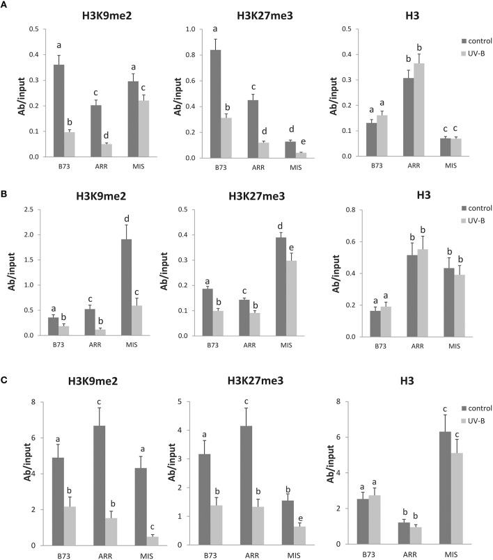P1 is a R2R3-MYB transcription factor that regulates the accumulation of a specific group of flavonoids in maize floral tissues, such as flavones and phlobaphenes. P1 is also highly expressed in leaves of maize landraces adapted to high altitudes and higher levels of UV-B radiation. In this work, we analyzed the epigenetic regulation of the P1 gene by UV-B in leaves of different maize landraces. Our results demonstrate that DNA methylation in the P1 proximal promoter, intron1 and intron2 is decreased by UV-B in all lines analyzed; however, the basal DNA methylation levels are lower in the landraces than in B73, a low altitude inbred line. DNA demethylation by UV-B is accompanied by a decrease in H3 methylation at Lys 9 and 27, and by an increase in H3 acetylation. smRNAs complementary to specific regions of the proximal promoter and of intron 2 3' end are also decreased by UV-B; interestingly, P1 smRNA levels are lower in the landraces than in B73 both under control conditions and after UV-B exposure, suggesting that smRNAs regulate P1 expression by UV-B in maize leaves. Finally, we investigated if different P1 targets in flower tissues are also regulated by this transcription factor in response to UV-B. Some targets analyzed show an induction in maize landraces in response to UV-B, with higher basal expression levels in the landraces than in B73; however, not all the transcripts analyzed were found to be regulated by UV-B in leaves.