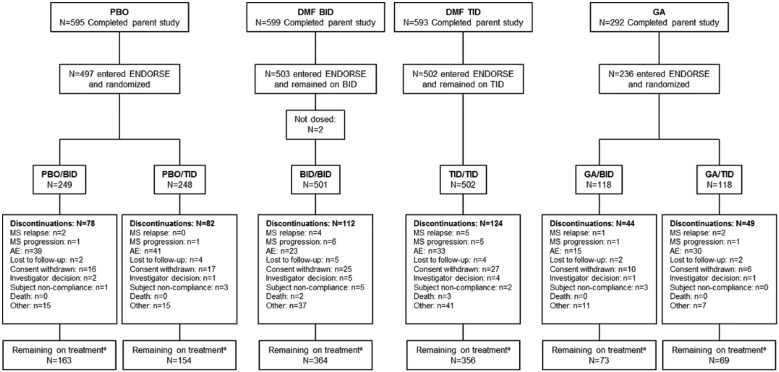 Methods: In ENDORSE, patients randomized to DMF 240 mg twice (BID) or thrice daily (TID) in DEFINE/CONFIRM continued this dosage, and those initially randomized to placebo (PBO) or glatiramer acetate (GA) were re-randomized to DMF 240 mg BID or TID.