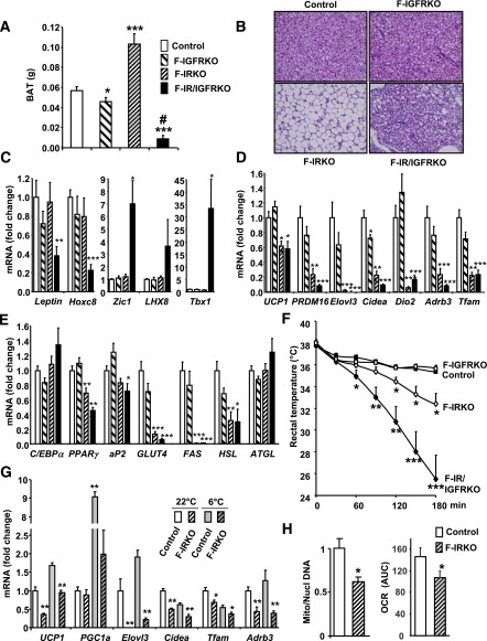 To determine the roles of insulin and insulin-like growth factor 1 (IGF-1) action in adipose tissue, we created mice lacking the insulin receptor (IR), IGF-1 receptor (IGF1R), or both using Cre-recombinase driven by the adiponectin promoter. Mice lacking IGF1R only (F-IGFRKO) had a ∼25% reduction in white adipose tissue (WAT) and brown adipose tissue (BAT), whereas mice lacking both IR and IGF1R (F-IR/IGFRKO) showed an almost complete absence of WAT and BAT. Interestingly, mice lacking only the IR (F-IRKO) had a 95% reduction in WAT, but a paradoxical 50% increase in BAT with accumulation of large unilocular lipid droplets. Both F-IRKO and F-IR/IGFRKO mice were unable to maintain body temperature in the cold and developed severe diabetes, ectopic lipid accumulation in liver and muscle, and pancreatic islet hyperplasia. Leptin treatment normalized blood glucose levels in both groups. Glucose levels also improved spontaneously by 1 year of age, despite sustained lipodystrophy and insulin resistance. Thus, loss of IR is sufficient to disrupt white fat formation, but not brown fat formation and/or maintenance, although it is required for normal BAT function and temperature homeostasis. IGF1R has only a modest contribution to both WAT and BAT formation and function.