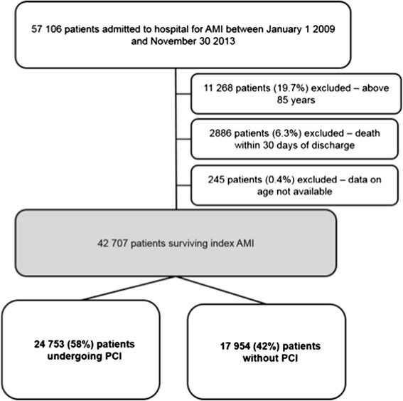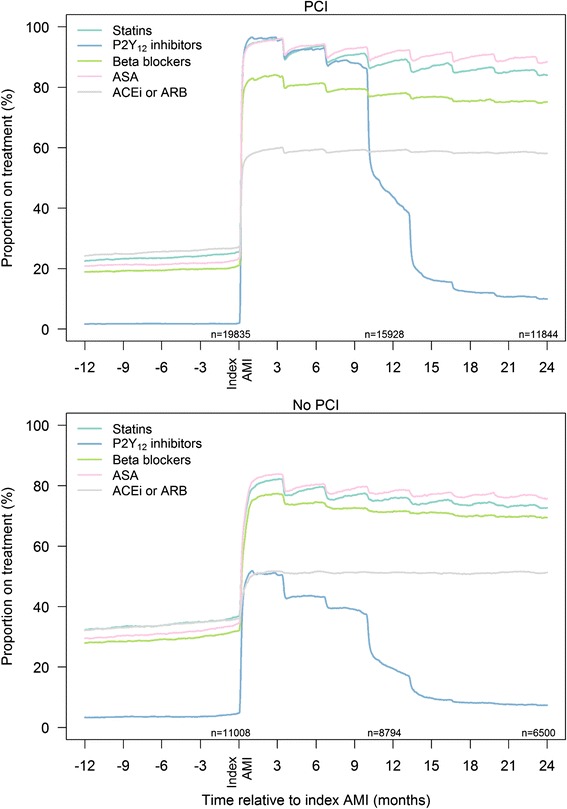 Results: The majority of patients were discharged on single or dual antiplatelet therapy (91 %), statins (90 %), beta-blockers (82 %), and angiotensin-converting enzyme inhibitors (ACEI)/angiotensin receptor II blockers (ARB) (60 %). Patients not undergoing percutaneous coronary intervention (PCI) (42 %) were less likely to be prescribed secondary preventive drugs compared with patients undergoing PCI. This was particular the case for dual antiplatelet therapy (43 % vs. 87 %). The adherence to prescribed drugs was high: 12 months after index AMI, 84 % of patients were still on aspirin, 84 % on statins, 77 % on beta-blockers and 57 % on ACEI/ARB. Few drug and dose adjustments were made during follow-up.