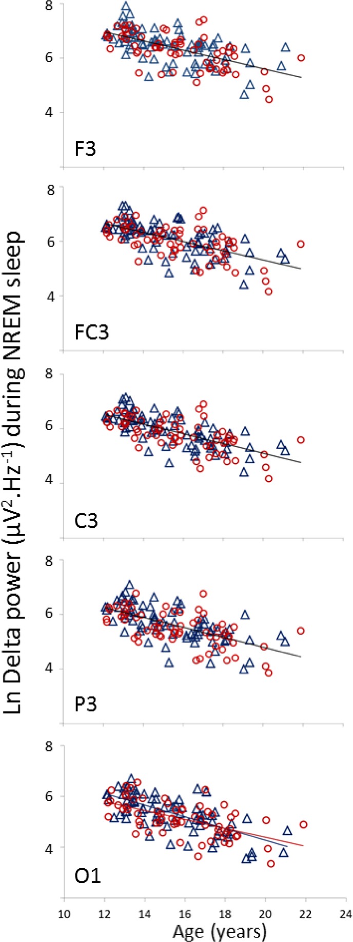 Results: Older age was associated with a lower percentage of N3 sleep, accompanied by higher percentages of N2, N1, and rapid eye movement (REM) sleep. Older boys compared with younger boys had more frequent awakenings and wakefulness after sleep onset, effects that were absent in girls. Delta (0.3-4 Hz) EEG power in nonrapid eye movement NREM sleep was lower in older than younger adolescents at all electrode sites, with steeper slopes of decline over the occipital scalp. EEG power in higher frequency bands was also lower in older adolescents than younger adolescents, with equal effects across electrodes. Percent delta power in the first NREM period was similar across age. African Americans had lower EEG power across frequency bands (delta to sigma) compared with Caucasians. Finally, replacing age with pubertal status in the models showed similar relationships.