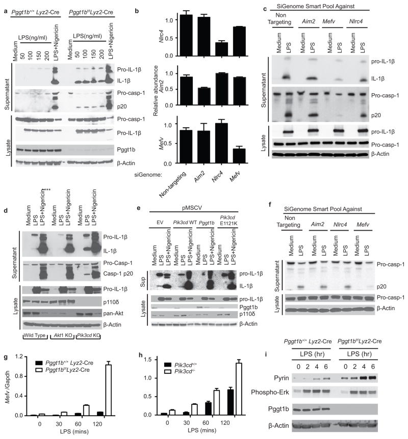 Deficiency in mevalonate kinase (MVK) causes systemic inflammation. However, the molecular mechanisms linking the mevalonate pathway to inflammation remain obscure. Geranylgeranyl pyrophosphate, a non-sterol intermediate of the mevalonate pathway, is the substrate for protein geranylgeranylation, a protein post-translational modification that is catalyzed by protein geranylgeranyl transferase I (GGTase I). Pyrin is an innate immune sensor that forms an active inflammasome in response to bacterial toxins. Mutations in MEFV (encoding human PYRIN) result in autoinflammatory familial Mediterranean fever syndrome. We found that protein geranylgeranylation enabled Toll-like receptor (TLR)-induced activation of phosphatidylinositol-3-OH kinase (PI(3)K) by promoting the interaction between the small GTPase Kras and the PI(3)K catalytic subunit p110δ. Macrophages that were deficient in GGTase I or p110δ exhibited constitutive release of interleukin 1β that was dependent on MEFV but independent of the NLRP3, AIM2 and NLRC4 inflammasomes. In the absence of protein geranylgeranylation, compromised PI(3)K activity allows an unchecked TLR-induced inflammatory responses and constitutive activation of the Pyrin inflammasome.