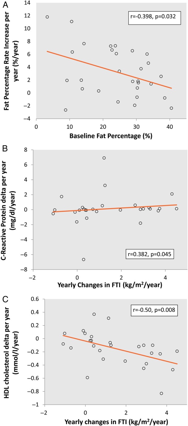 Results: Median follow-up was 26 (range 17-27) months. Mean increase in weight was 1.8 ± 2.8 kg/year. However, BCM(®) analysis revealed a mean increase in fat mass of 3.0 ± 3.2 kg/year with a loss of lean mass of 2.3 ± 4.1 kg/year during follow-up. The increase in fat mass was associated with the conicity index, suggesting that increases in fat mass are based mainly on abdominal adipose tissue. Changes in fat mass were directly associated with inflammation parameters such as C-reactive protein (r = 0.382, P = 0.045) and inversely associated with high-density lipoprotein cholesterol (r=-0.50, P = 0.008).