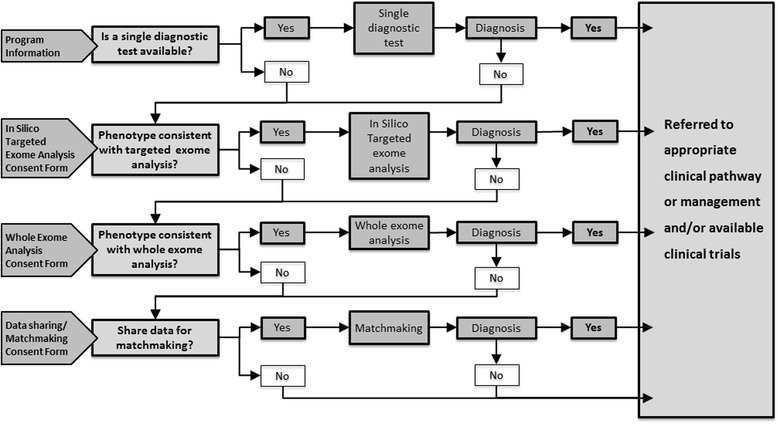 Results: Briefly the platform : i) offers multiple options including non-genetic testing; monogenic and genomic (targeted in silico filtered and whole exome) analysis; and matchmaking; ii) is delivered in a patient-centric manner that is resonant with the patient journey, it has multiple points for entry, exit and re-entry to allow people access to information they can use, when they want to receive it; iii) is synchronous with precision phenotyping methods; iv) captures new knowledge, including multiple expert review; v) is integrated with current translational genomic research activities and best practice; and vi) is designed for flexibility for interactive generation of, and integration with, clinical research for diagnostics, community engagement, policy and models of care.