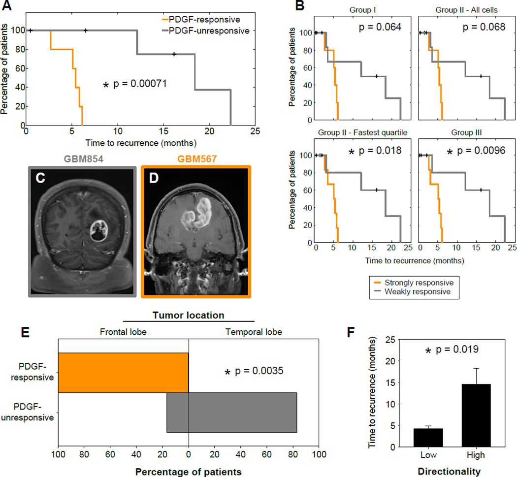 Glioblastoma multiforme is a heterogeneous and infiltrative cancer with dismal prognosis. Studying the migratory behavior of tumor-derived cell populations can be informative, but it places a high premium on the precision of in vitro methods and the relevance of in vivo conditions. In particular, the analysis of 2D cell migration may not reflect invasion into 3D extracellular matrices in vivo. Here, we describe a method that allows time-resolved studies of primary cell migration with single-cell resolution on a fibrillar surface that closely mimics in vivo 3D migration. We used this platform to screen 14 patient-derived glioblastoma samples. We observed that the migratory phenotype of a subset of cells in response to platelet-derived growth factor was highly predictive of tumor location and recurrence in the clinic. Therefore, migratory phenotypic classifiers analyzed at the single-cell level in a patient-specific way can provide high diagnostic and prognostic value for invasive cancers.