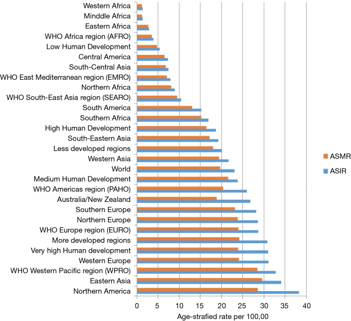 Results: Lung cancer with standardized incidence rate (ASIR) and standardized mortality rate (ASMR), equal to 23.1 and 19.7 (in 100,000 people), respectively. The highest and lowest values of mortality incidence ratio (MIR) for lung cancer due to continents division were 0.93 and 0.71 for Eastern Africa and Australia/New Zealand, respectively. Univariate analysis showed significant relationship (P<0.0001) between ASIR and ASMR with life expectancy at birth and mean years of schooling.