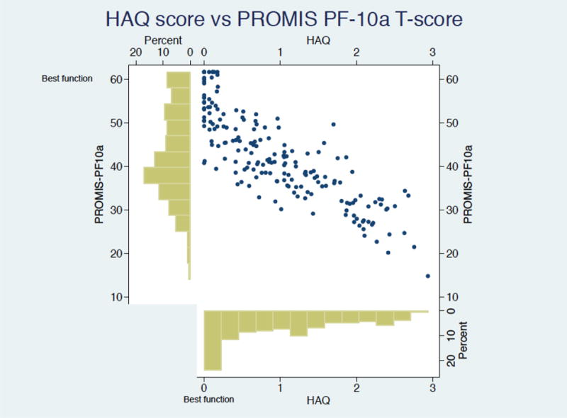 Conclusion: PF-10a was feasible to implement in a diverse RA population. It strongly correlates with the HAQ but has fewer ceiling effects and is responsive to changes in RA disease activity, suggesting its validity for use in routine clinical practice.