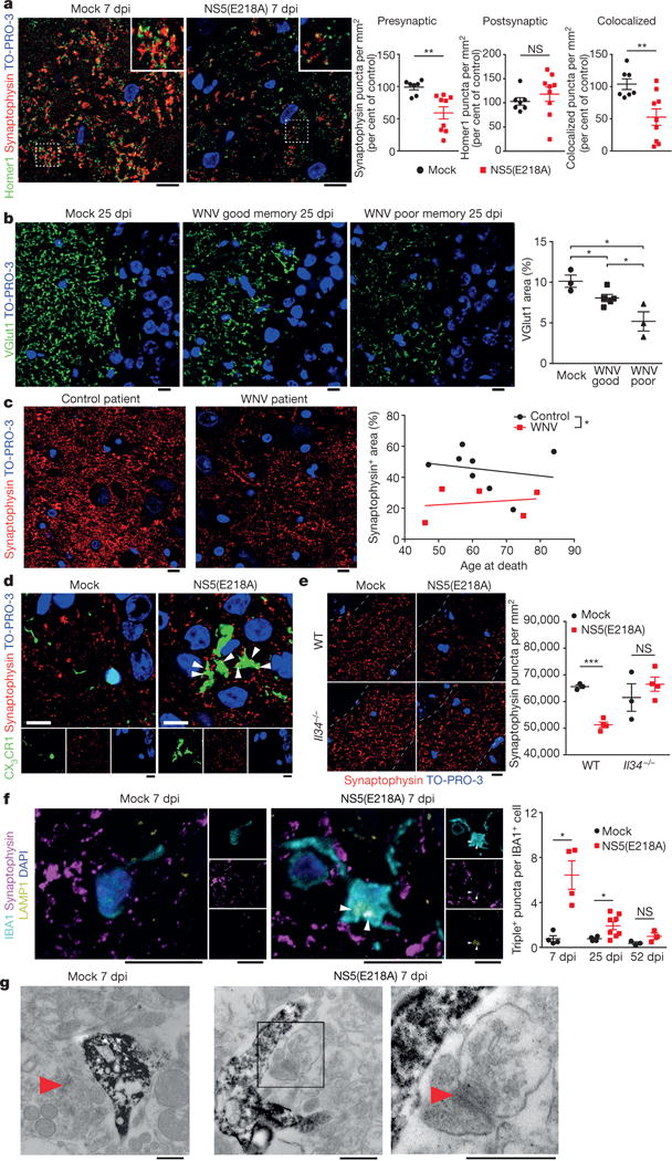 Over 50% of patients who survive neuroinvasive infection with West Nile virus (WNV) exhibit chronic cognitive sequelae. Although thousands of cases of WNV-mediated memory dysfunction accrue annually, the mechanisms responsible for these impairments are unknown. The classical complement cascade, a key component of innate immune pathogen defence, mediates synaptic pruning by microglia during early postnatal development. Here we show that viral infection of adult hippocampal neurons induces complement-mediated elimination of presynaptic terminals in a murine WNV neuroinvasive disease model. Inoculation of WNV-NS5-E218A, a WNV with a mutant NS5(E218A) protein leads to survival rates and cognitive dysfunction that mirror human WNV neuroinvasive disease. WNV-NS5-E218A-recovered mice (recovery defined as survival after acute infection) display impaired spatial learning and persistence of phagocytic microglia without loss of hippocampal neurons or volume. Hippocampi from WNV-NS5-E218A-recovered mice with poor spatial learning show increased expression of genes that drive synaptic remodelling by microglia via complement. C1QA was upregulated and localized to microglia, infected neurons and presynaptic terminals during WNV neuroinvasive disease. Murine and human WNV neuroinvasive disease post-mortem samples exhibit loss of hippocampal CA3 presynaptic terminals, and murine studies revealed microglial engulfment of presynaptic terminals during acute infection and after recovery. Mice with fewer microglia (Il34(-/-) mice with a deficiency in IL-34 production) or deficiency in complement C3 or C3a receptor were protected from WNV-induced synaptic terminal loss. Our study provides a new murine model of WNV-induced spatial memory impairment, and identifies a potential mechanism underlying neurocognitive impairment in patients recovering from WNV neuroinvasive disease.