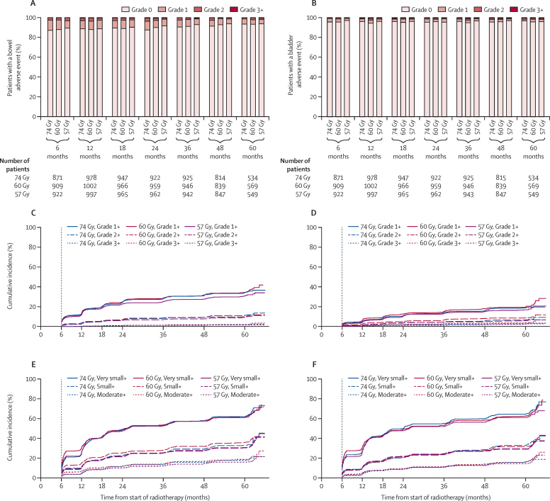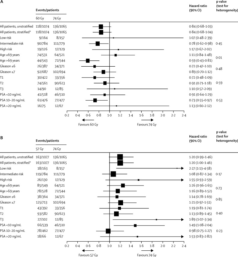Findings: Between Oct 18, 2002, and June 17, 2011, 3216 men were enrolled from 71 centres and randomly assigned (74 Gy group, 1065 patients; 60 Gy group, 1074 patients; 57 Gy group, 1077 patients). Median follow-up was 62·4 months (IQR 53·9-77·0). The proportion of patients who were biochemical or clinical failure free at 5 years was 88·3% (95% CI 86·0-90·2) in the 74 Gy group, 90·6% (88·5-92·3) in the 60 Gy group, and 85·9% (83·4-88·0) in the 57 Gy group. 60 Gy was non-inferior to 74 Gy (HR 0·84 [90% CI 0·68-1·03], pNI=0·0018) but non-inferiority could not be claimed for 57 Gy compared with 74 Gy (HR 1·20 [0·99-1·46], pNI=0·48). Long-term side-effects were similar in the hypofractionated groups compared with the conventional group. There were no significant differences in either the proportion or cumulative incidence of side-effects 5 years after treatment using three clinician-reported as well as patient-reported outcome measures. The estimated cumulative 5 year incidence of Radiation Therapy Oncology Group (RTOG) grade 2 or worse bowel and bladder adverse events was 13·7% (111 events) and 9·1% (66 events) in the 74 Gy group, 11·9% (105 events) and 11·7% (88 events) in the 60 Gy group, 11·3% (95 events) and 6·6% (57 events) in the 57 Gy group, respectively. No treatment-related deaths were reported.