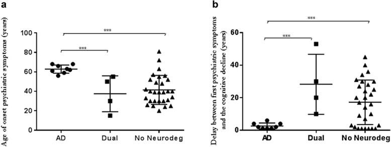 Results: Of 957 patients, 69 had an initial diagnosis of a psychiatric disorder. Among these 69 patients, 14 (20.2 %) had a CSF AD profile, 5 (7.2 %) presented with an intermediate CSF profile and 50 (72.4 %) had a non-AD CSF profile. Ultimately, 13 (18.8 %) patients were diagnosed with AD. We show that in the AD group psychiatric symptoms occurred later and the delay between the first psychiatric symptoms and the cognitive decline was shorter.