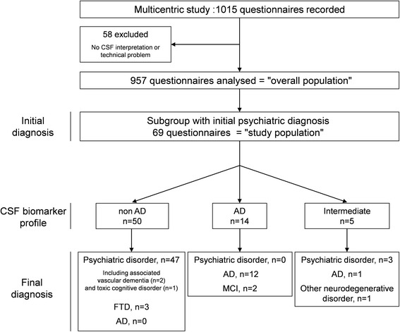 Conclusions: This study revealed that about 20 % of patients with a primary psychiatric disorder diagnosis before undergoing a CSF exploration for cognitive disorder displayed a CSF biomarker AD profile. In memory clinics, it seems important to consider AD as a possible diagnosis before finalizing a diagnosis of a psychiatric disorder.