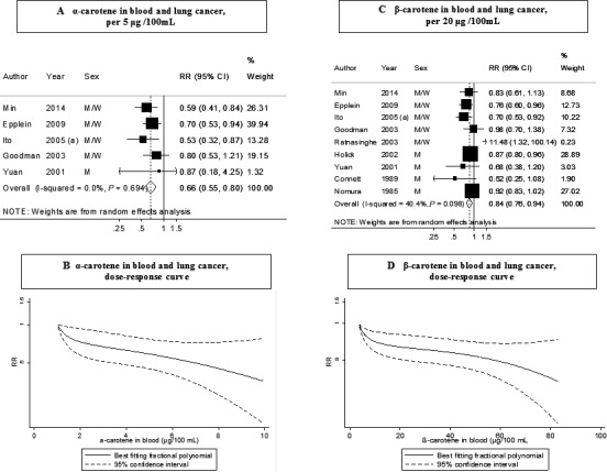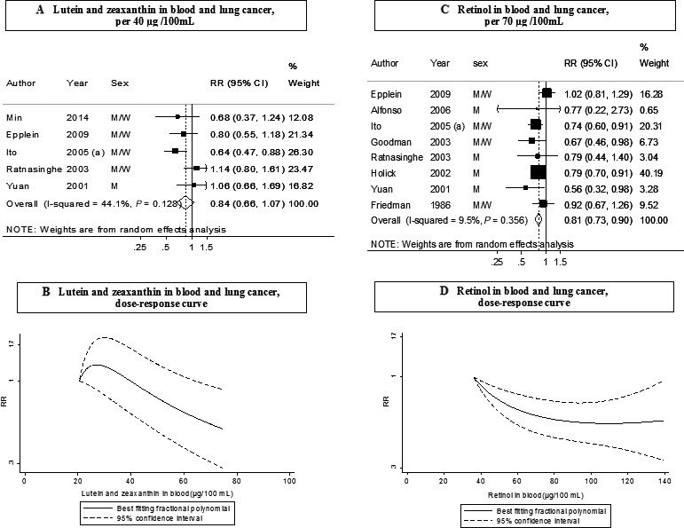 Carotenoids and retinol are considered biomarkers of fruits and vegetables intake, and are of much interest because of their anti-inflammatory and antioxidant properties; however, there is inconsistent evidence regarding their protective effects against lung cancer. We conducted a meta-analysis of prospective studies of blood concentrations of carotenoids and retinol, and lung cancer risk. We identified relevant prospective studies published up to December 2014 by searching the PubMed and several other databases. We calculated summary estimates of lung cancer risk for the highest compared with lowest carotenoid and retinol concentrations and dose-response meta-analyses using random effects models. We used fractional polynomial models to assess potential nonlinear relationships. Seventeen prospective studies (18 publications) including 3603 cases and 458,434 participants were included in the meta-analysis. Blood concentrations of α-carotene, β-carotene, total carotenoids, and retinol were significantly inversely associated with lung cancer risk or mortality. The summary relative risk were 0.66 (95% confidence interval [CI]: 0.55-0.80) per 5 μg/100 mL of α-carotene (studies [n] = 5), 0.84 (95% CI: 0.76-0.94) per 20 μg/100 mL of β-carotene (n = 9), 0.66 (95% CI: 0.54-0.81) per 100 μg/100 mL of total carotenoids (n = 4), and 0.81 (95% CI: 0.73-0.90) per 70 μg/100 mL of retinol (n = 8). In stratified analysis by sex, the significant inverse associations for β-carotene and retinol were observed only in men and not in women. Nonlinear associations were observed for β-carotene, β-cryptoxanthin, and lycopene, with stronger associations observed at lower concentrations. There were not enough data to conduct stratified analyses by smoking. In conclusion, higher blood concentrations of several carotenoids and retinol are associated with reduced lung cancer risk. Further studies in never and former smokers are needed to rule out confounding by smoking.